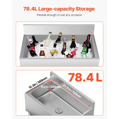 VEVOR Drop in Ice Chest, 28"L x 16"W x 17"H Stainless Steel Drop in Cooler, 87.6 Quart Commercial Ice Bin with Flip Lid for Outdoor Kitchen Patio Bar, Drain-pipe Set Included, for Cold Wine Beer