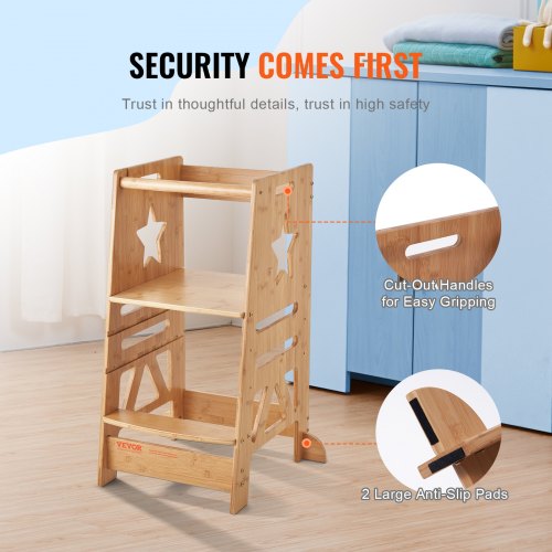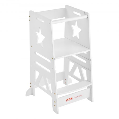 VEVOR Folding Step Stool for Toddlers, Adjustable 3-Height Kids Kitchen Step Stool, Solid Wood Children's Learning Tower with Safety Guard, Versatile for Kitchen, Bedroom, Bathroom
