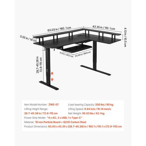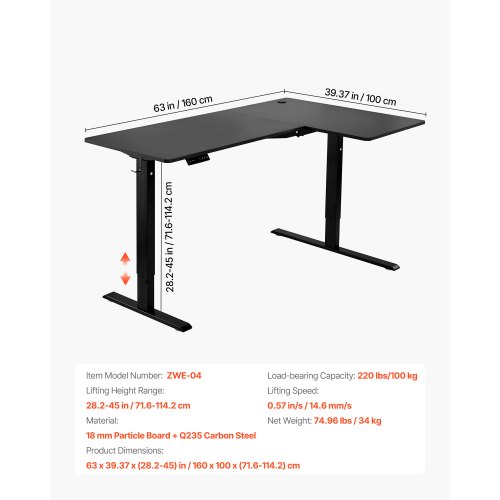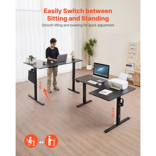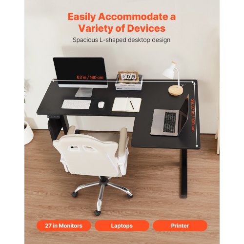 VEVOR L Shaped Desk, Electric Adjustable Height Corner Gaming Desk with Dual Hooks, Heavy Duty Carbon Steel L-Shaped Computer Table with Power Strip for Home, Office, Dorm, Easy to Assemble, Black