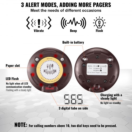 VEVOR Restaurant Pager System, Wireless 400m Long Range Lineup Waiting Queue Signal, Guest Customer Calling Beepers with Vibration & Flashing, 10 Buzzers for Food Truck, Church, Nursery, Hospital