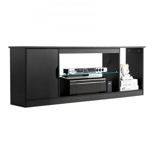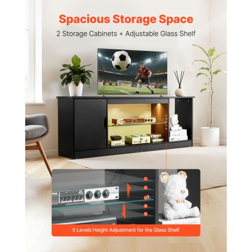 VEVOR TV Stand for TVs up to 65 inch, Modern Entertainment Center with Light Strip, Wooden TV Cabinet Storage with Glass Shelf and Adjustable Shelves, Console Table for Living Room and Bedroom, Black