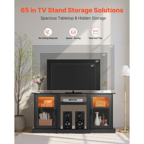 VEVOR TV Stand for TVs up to 65 inch, Modern Entertainment Center with Light Strip, Wooden TV Cabinet Storage with Glass Doors and Adjustable Shelves, Console Table for Living Room and Bedroom, Black