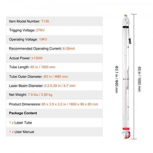 VEVOR 130W CO2 Laser Tube, 65 in (1650 mm) Length, 3.1 in (80 mm) Dia Borosilicate Glass Laser Cutter Tube with Metal Head, 10,000hr Wires Preconnected for Laser Engraver Engraving Cutting Machine