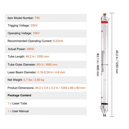 VEVOR 90W CO2 Laser Tube, 49.2 in (1250 mm) Length, 3.1 in (80 mm) Dia Borosilicate Glass Laser Cutter Tube with Metal Head, 10,000hr Wires Preconnected for Laser Engraver Engraving Cutting Machine