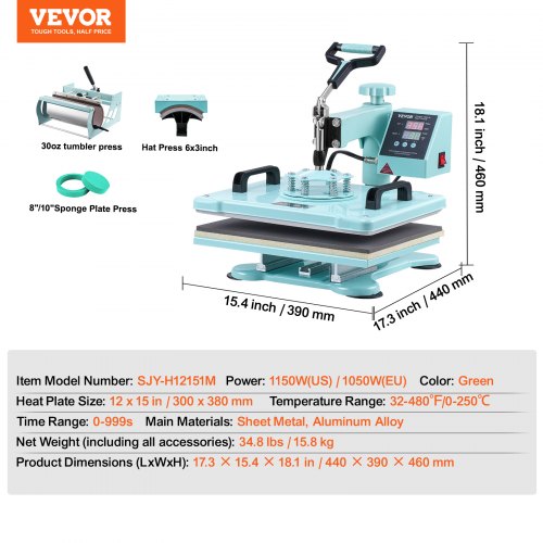 VEVOR Heat Press Machine 12x15 in 5 in 1 with 30oz Tumbler Press T-Shirts Green