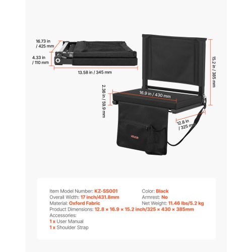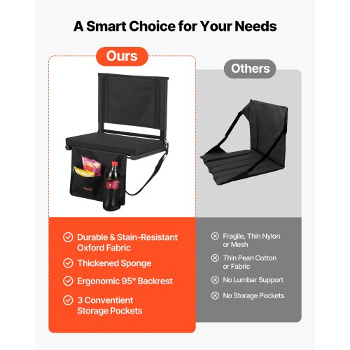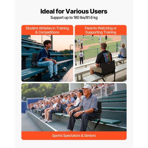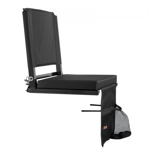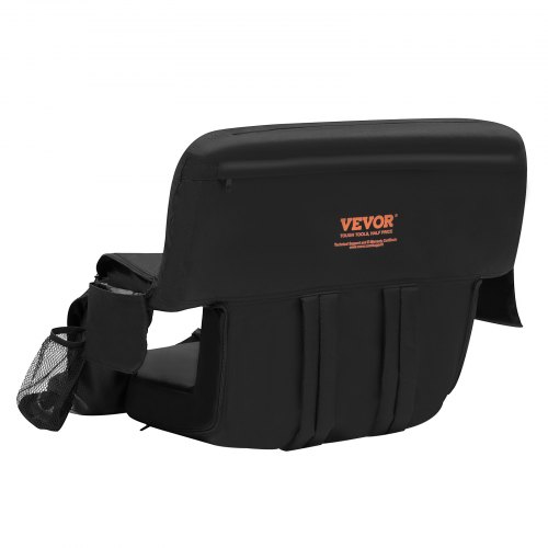 VEVOR Stadium Seat, Folding Bleacher Seat with Back Support and Thick Cushion, Padded Stadium Seats for Bleacher Includes Shoulder Strap, Hooks, Cup Holder, and Side Pocket, Black Bleachers Chair