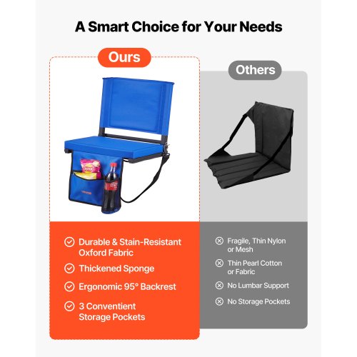 VEVOR Stadium Seat, Folding Bleacher Seat with Back Support & Thick Cushion, Padded Stadium Seats for Bleacher Includes Shoulder Strap, Hooks, Cup Holder, and Side Pocket, Blue Bleachers Chair
