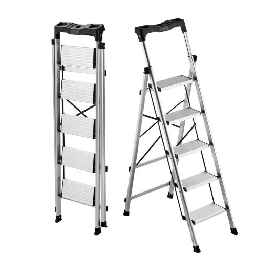 VEVOR 5 Step Ladder, Folding Step Stool with Wide Anti-Slip Pedal and Comfort Handgrip, 330 lbs Capacity Portable Aluminum Stepladder, Multi-Use for Kitchen, Warehouse, Household and Office, Silver