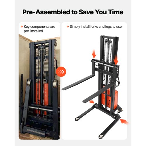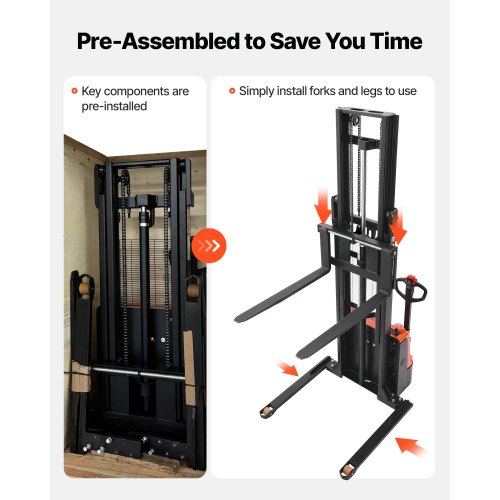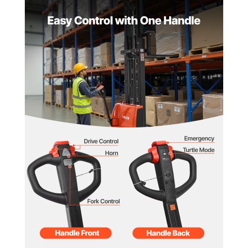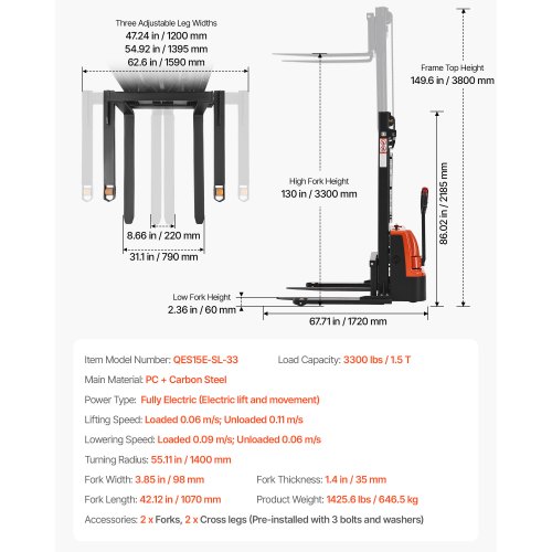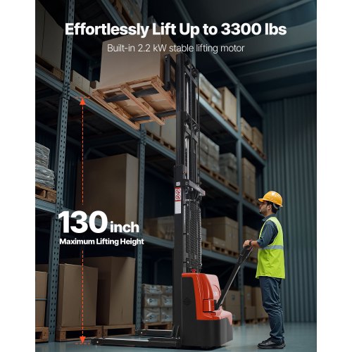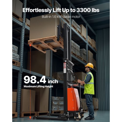 VEVOR Full Electric Pallet Stacker, 3300 lbs Capacity, Pallet Lift Stacker Forklift with Straddle Legs & Forks, 127.6 Inches Lifting Height & 8.66-31.1 Inches Adjustable Fork Width, Orange & Black