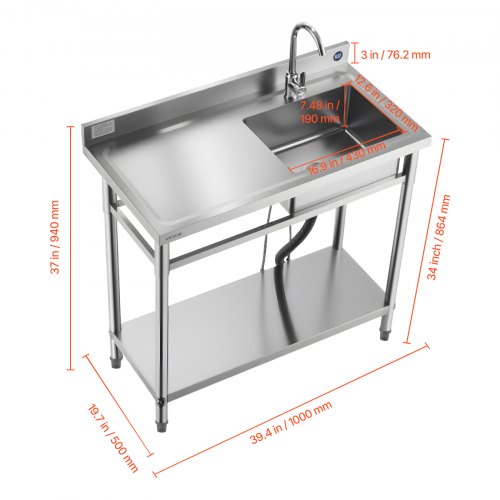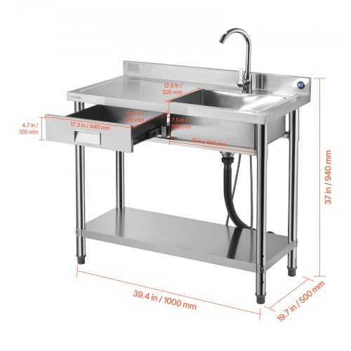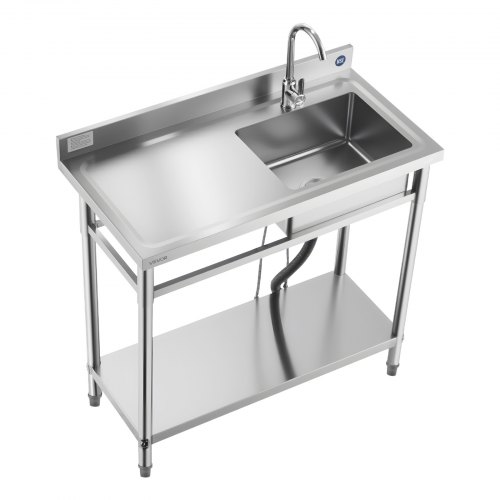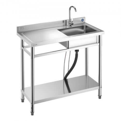 VEVOR Stainless Steel Utility Sink, Free Standing Single Bowl Commercial Kitchen Sink Set w/Workbench, 39.4 x 19.1 x 37.4 in Commercial Single Bowl Sinks for Garage, Restaurant, Laundry