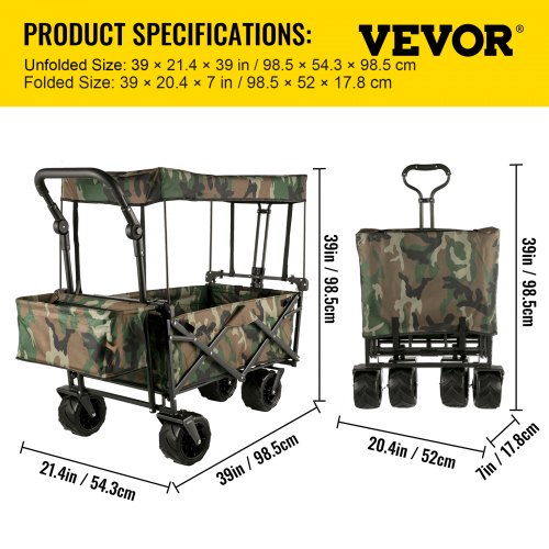 VEVOR Collapsible Folding Wagon with Removable Canopy, Heavy Duty Foldable Wagon Utility Cart for Garden, Camping, Grocery Cart, Beach Wagon Cart with Wheels and Rear Storage, Camouflage