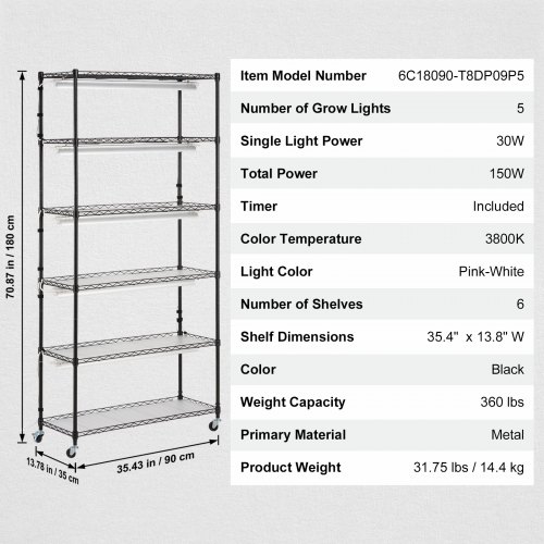 VEVOR Plant Stand with Grow Light, 6-Tier Large Tall Plant Shelf with 150W Full Spectrum Grow Light, Indoor LED Plant Light with Timer and Wheel for Seed Starting 35.4" L x 13.8" W x 70.9" H