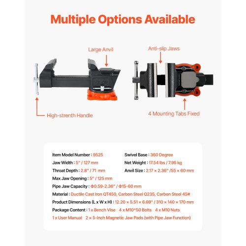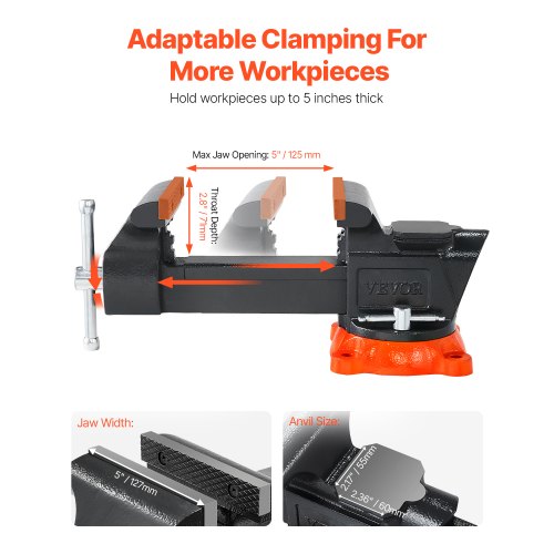 VEVOR Bench Vise, 5" Jaw Width, 5" Max Jaw Opening Multipurpose Vise with 360° Swivel Locking Base, 2.8" Throat Depth, Heavy Duty Ductile Iron Workbench Vise with Anvil, for Clamping Round Pipes