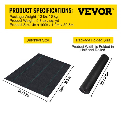 VEVOR Garden Weed Barrier Fabric, 5.8 OZ Heavy Duty Landscape Fabric, 4ft x 100ft Weed Block Control for Garden Ground Cover, Woven Geotextile Fabric for Landscaping, Gardening, Underlayment, Black