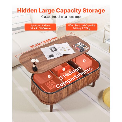 VEVOR 39.4 in Lift Top Coffee Table, Fluted Oval Coffee Table with 3 Hidden Compartment, Mid Century Wooden Oval Center Desk with Storage, Lift Up Tabletop for Home & Office, Easy Assembly, Walnut