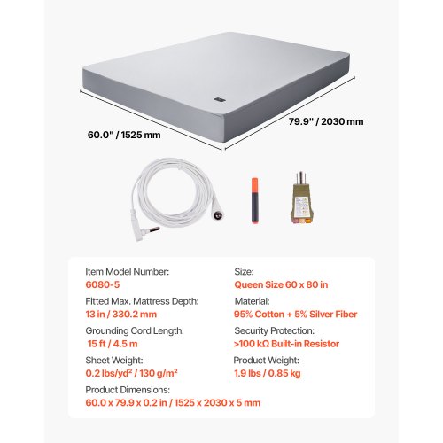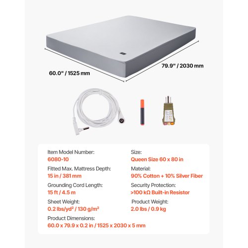 VEVOR Grounding Sheets, Queen Size, 90% Cotton + 10% Pure Silver Fiber, Earth Grounded Fitted Bed Sheets, with Grounding Cord & Tester, for Improved Sleep & Wellness (Gray, Queen - 60 x 80 x 15 in)