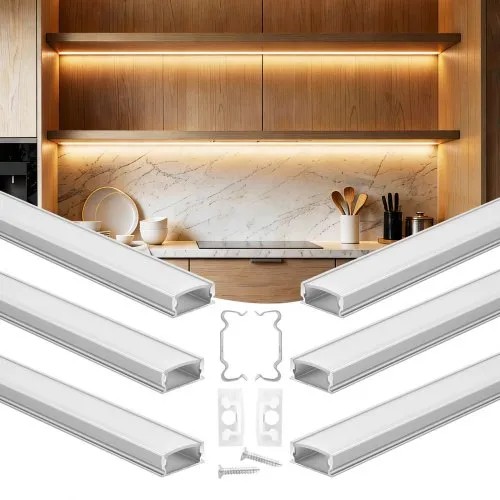 VEVOR 6-Pack 3.3 ft/1M U Shape LED Aluminum Channel, with Milky Cover, End Caps and Mounting Clips, Aluminum Profile for LED Strip Light Installations, Easy Installation, for Under Cabinet Counter