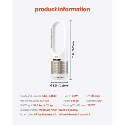 VEVOR Tower Fan Bladeless, 16.4ft/s Velocity Floor Fan that Blows Cold Air, 80° Oscillating 8-Speed Fans, 8H Timer, Standing Fans with H13 HEPA Filtration, Remote Control & Air Purification Mode
