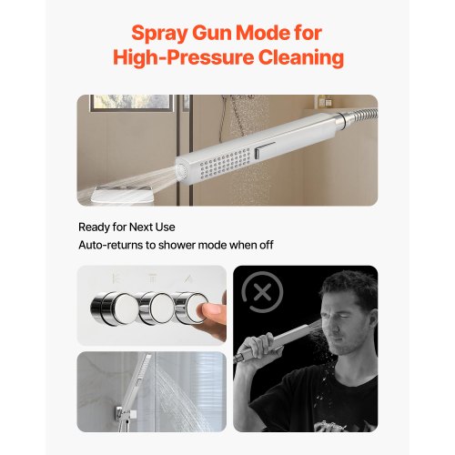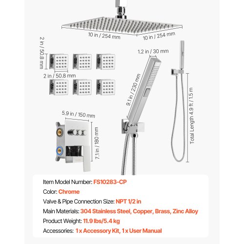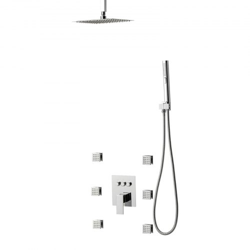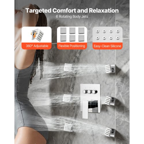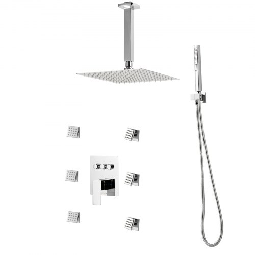 VEVOR Shower Faucet Set, 10 Inch Ceiling Mount Rainfall Shower System with 6 Body Jets and 2 in 1 Handheld Spray, Rotatable 3-Function Rain Head System Set, Complete Brass Valve and Trim Kit, Chrome
