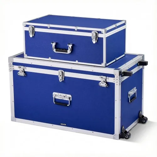 VEVOR Metal Storage Trunk, Set of 2, Wooden Suitcase Storage Boxes with Padlocks, Large Trunk Includes Casters and 3 Metal Handles, Decorative Store Chest with Lids for Travel, Apartment, Dorm, Blue