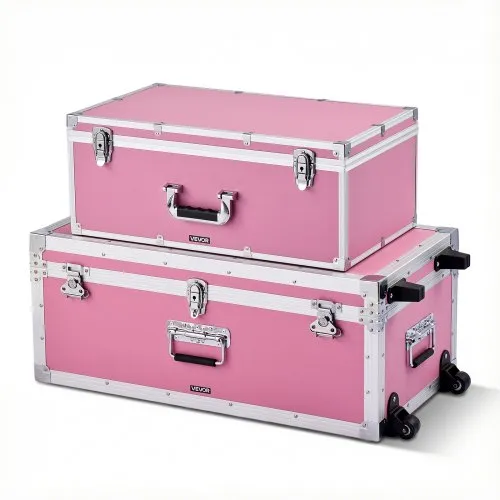 VEVOR Metal Storage Trunk, Set of 2, Wooden Suitcase Storage Boxes with Padlocks, Large Trunk Includes Casters and 3 Metal Handles, Decorative Store Chest with Lids for Travel, Apartment, Dorm, Pink