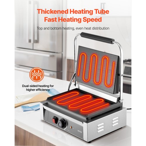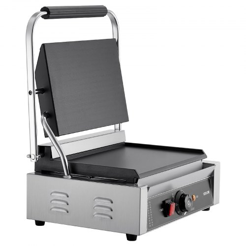 VEVOR Commercial Panini Grill, 1800W Electric Sandwich Panini Maker, Stainless Steel Sandwichs Press Grill with Handle and Temp Control, 13.5x9.3 in Full Flat Enamel Plate, for Hamburger Steak Bacon