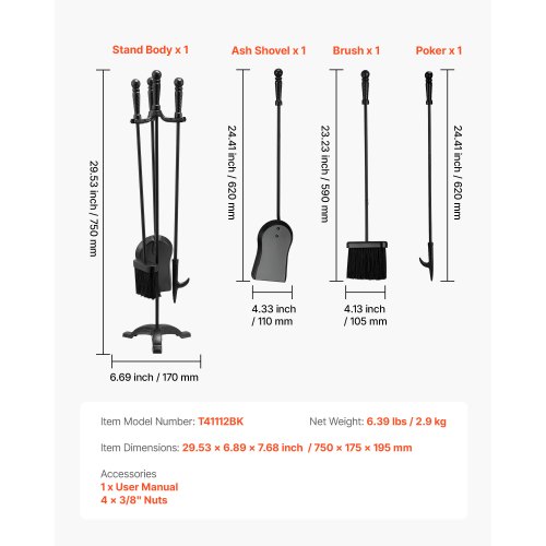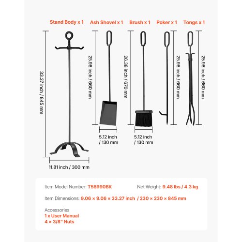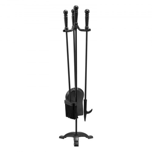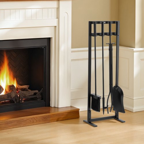 VEVOR Fireplace Tool Set, 4 PCS Fire Tool Set and Holder with Three-Prong Stand, Ash Shovel, Brush, Fire Place Poker, Wrought Iron Fireplace Accessories for Campfire Indoor/Outdoor, Black