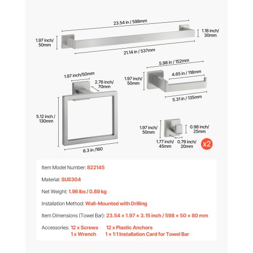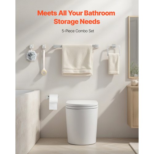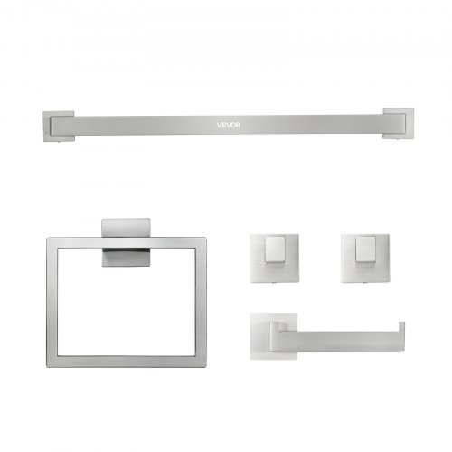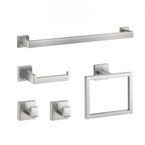 VEVOR Brushed Nickel Bathroom Hardware Set, 5 Pieces Bathroom Accessories Set, Stainless Steel 24 inch Towel Bar, Towel Rack, 2 Robe Towel Hooks, Toilet Paper Holder for Bath Room, Wall Mounted