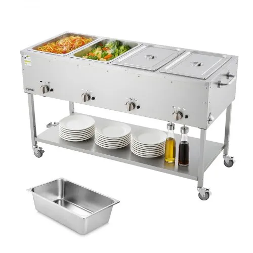 VEVOR 4-Pan Commercial Propane Steam Table, LP Gas Outdoor Soup Warmer with Drain Valve and 3" Wheels, Stainless Steel Propane Food Warmer with Independent Temp Control, for Restaurant Outdoor Camping