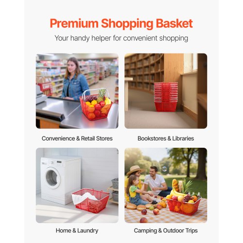 VEVOR Shopping Baskets, 12 PCS, 22L Stackable Metal Grocery Baskets with Handles, Dense Mesh Structure, Holds up to 44 lbs, Portable for Grocery, Retail, Stores, Supermarket, Bookstore, Home Use, Red