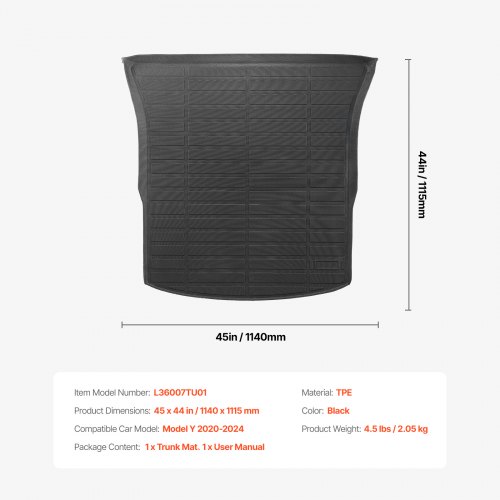 VEVOR Cargo Mat Compatible with Tesla Model Y 2020-2024, Precise Fit Trunk Mat for SUVs, TPE Trunk Protector Replacement, Black (1PCS)