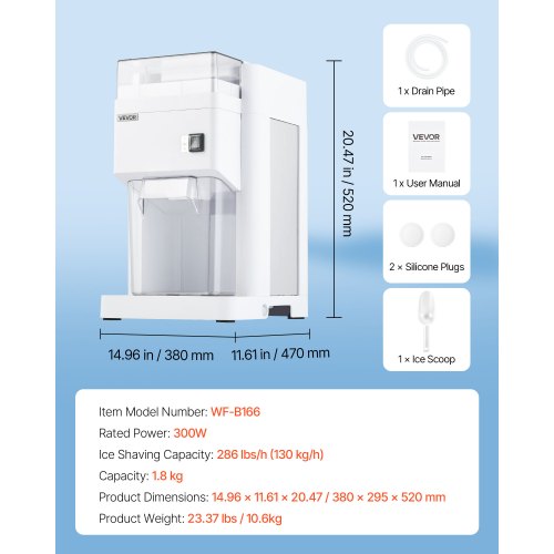 VEVOR Commercial Ice Shaver Machine, 1.91QT /1.8L Large Electric Ice Cube Crusher Shaved Maker with 300W Premium Motor, Stainless Steel Blades, for Bar Mixing Seafood Preservation Home Party, White