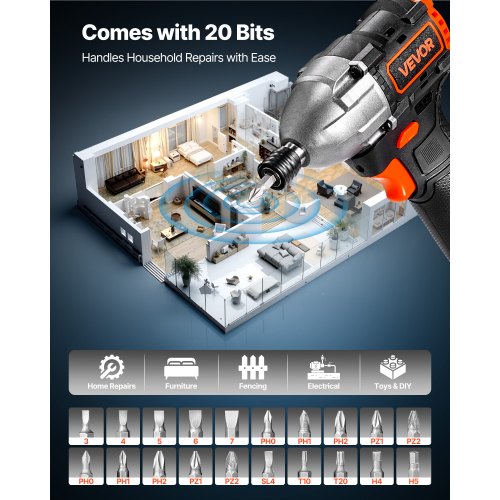 VEVOR Impact Driver, 1/4 Inch, 3000 RPM Max Speed, 12 V Brushless Motor, Electric Cordless Impact Driver Kit with Battery and Charger, 20 Bits, LED Work Light, for Furniture, Electrical, Home Repairs