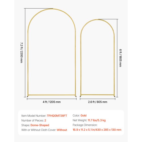 VEVOR Wedding Arch Backdrop Stand, 7.2FT & 6FT, Set of 2 Stand with Case Connection & Chassis Crossbar Design, Easy-to-Assemble Gold Stand with Premium Metal, Fit for Birthday, Celebration, Holiday