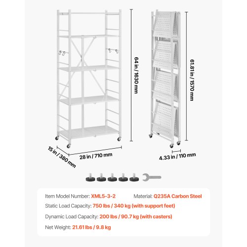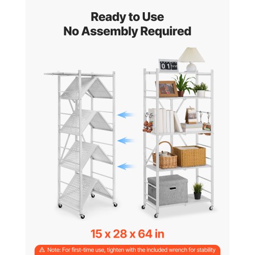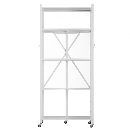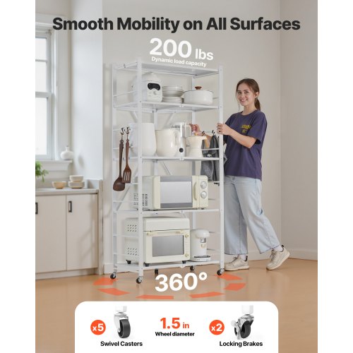 VEVOR 5-Tier Foldable Storage Shelf, 28 W x 15D x 64H Inch Folding Metal Rack Shelving Unit, No Assembly Organizer Shelf with 5 Wheels & 4 Hooks for Pantry, Kitchen, Garage, Basement, White