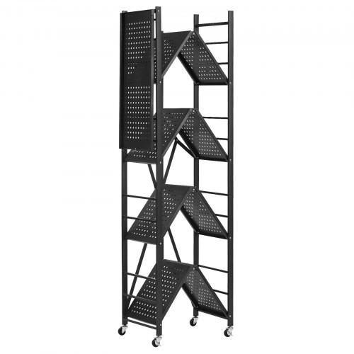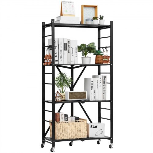 VEVOR 4-Tier Foldable Storage Shelf, 26W x 13D x 46H Inch Folding Metal Rack Shelving Unit, No Assembly Organizer Shelf with 5 Wheels & 4 Hooks for Pantry, Kitchen, Garage, Basement, Black