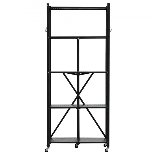 VEVOR 5-Tier Foldable Storage Shelf, 28W x 15D x 64H Inch Folding Metal Rack Shelving Unit, No Assembly Organizer Shelf with 5 Wheels & 4 Hooks for Pantry, Kitchen, Garage, Basement, Black