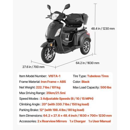 VEVOR 3-Wheel Folding Mobility Scooter for Seniors 12 Mile Range 265LBS Capacity