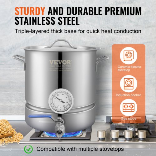 VEVOR Stainless Steel Kettle, 5 GALLON Brewing Pot, Tri Ply Bottom for Beer, Brew Kettle Pot, Home Brewing Supplies Includes Lid, Handle, Thermometer, Ball Valve Spigot, Filter, Filter Tray