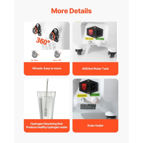 VEVOR Hydrogen Inhalation Machine, 99.99% High Purity Hydrogen Inhaler, HO-Separated 1500ml/min (1000 H+500 O) Dual Port Hydrogen Oxygen Inhaler, Hydrogen-Rich Water Generator with Wheels for Home