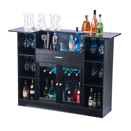 VEVOR Home Bar Unit, Wine Bar Cabinet Table 4-Tier with Storage Drawer Shelves, Wine Glass Holder, Bottle Rack, LED Light, Wood & Metal Liquor Cabinet for Home, Basement, Kitchen, Living Room, Black