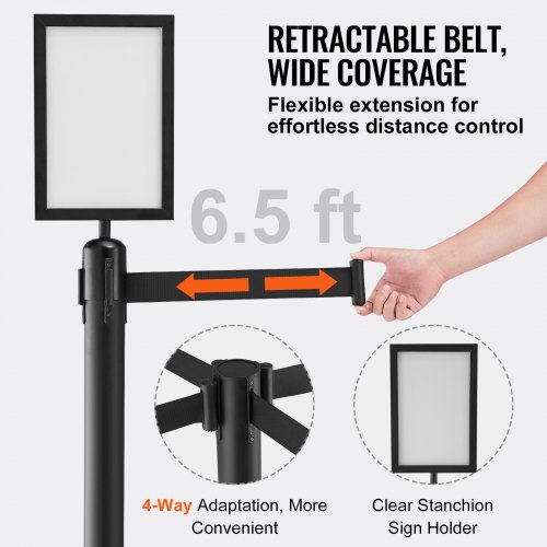 VEVOR Crowd Control Stanchions, 6-Pack Crowd Control Barriers, Carbon Steel Baking Painted Stanchion Queue Post with Sign Holder & 3PCS 6.5FT Retractable Belt, Belt Barrier Line Divider, Easy Assembly