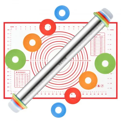 VEVOR Adjustable Rolling Pin, Stainless Steel Dough Roller Designs, Rolling Pin with Thickness Rings and Pastry Baking Nonstick Mat Set, for Baking Fondant, Pizza, Pie, Pastry, Pasta, Dough, Cookies
