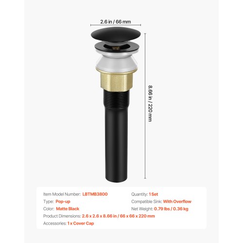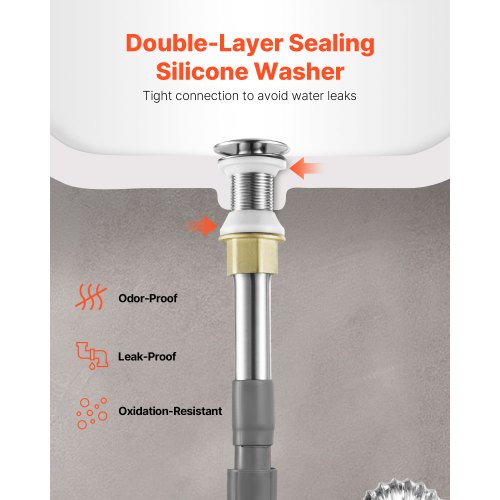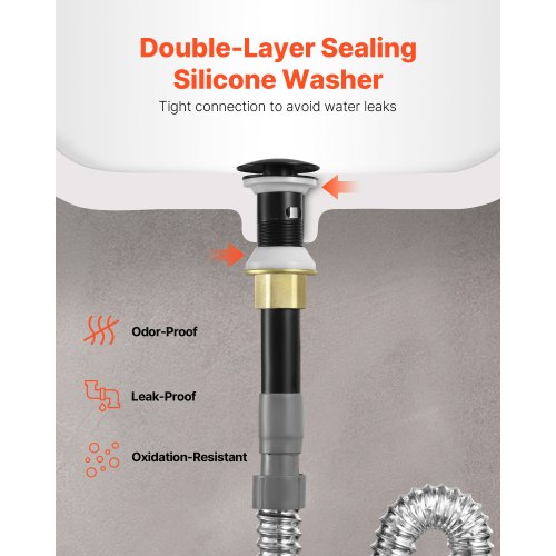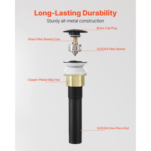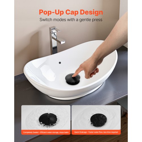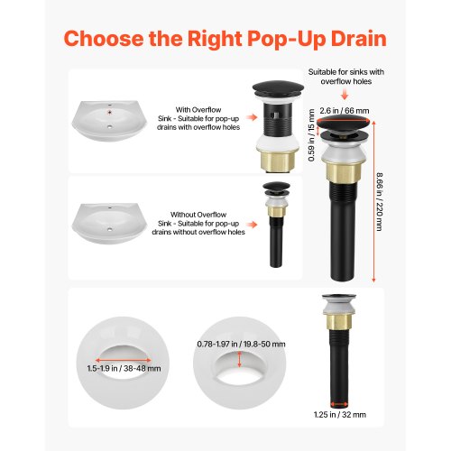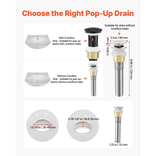 VEVOR Bathroom Sink Drain with Overflow, Brass and 304 Stainless Steel Pop Up Drains, Anti-Clogging Vessel Sink Drain Strainer, All Metal Hair Catcher Drains Stopper, for Sinks with Overflow Holes