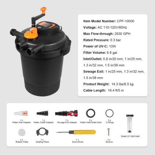 VEVOR Bio Pressure Pond Filter, Up to 2000 Gallons, with 13W UV-C Light, 1840 GPH, Pressurized Biological Pond Filter System Filtration Equipment for Fountain Pool, Koi Fish Aquarium Tank Garden Water