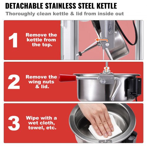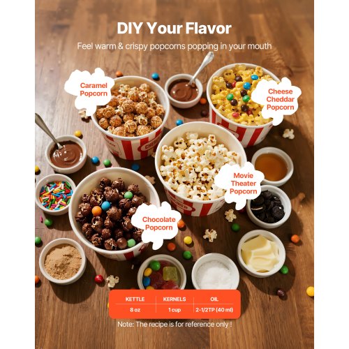 The VEVOR 12 Oz Popcorn Machine is made to make popcorn like a pro with our VEVOR's 12 Oz Popper. 1. Power up the machine and preheat the kettle. With 1440w of power, it won't take long. Once preheated, add your corn and oil, then let the device do its job. The 850w kettle can pop up to 80 cups per batch. This keeps guests or customers happy. These three simple switches make operation easy, even for newbies. The 100w warming deck and 60w light keep your popcorn fresh and bright. Cleaning is easy with the detachable lid and magnetic doors. With a strong steel frame and tempered glass, this machine is built to last. Enjoy movie nights or parties with fresh, warm popcorn. All you need is this machine and your favorite popcorn seasonings! Get ready to pop some serious corn!