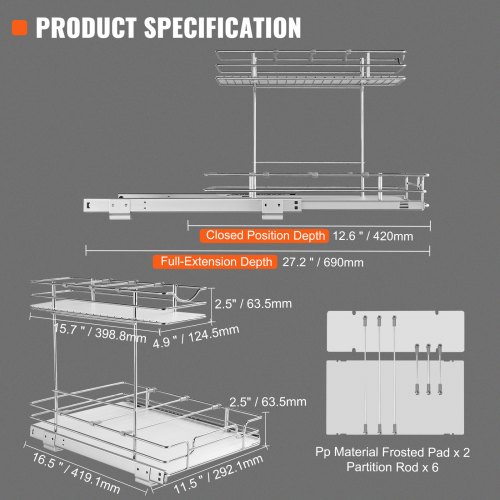 VEVOR 2 Tier 12"W x 17"D Pull Out Cabinet Organizer, Heavy Duty Slide Out Pantry Shelves, Chrome-Plated Steel Roll Out Drawers, Sliding Drawer Storage for Inside Kitchen Cabinet, Bathroom, Under Sink