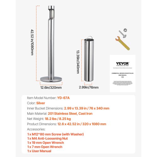 VEVOR Cigarette Butt Receptacle, Stainless Steel Cylinder Cigarette Butt Container, Freestanding and Weatherproof Outdoor Cigarette Butt Disposal for Garden, Office, Restaurant, Hotel, Bar, Silver