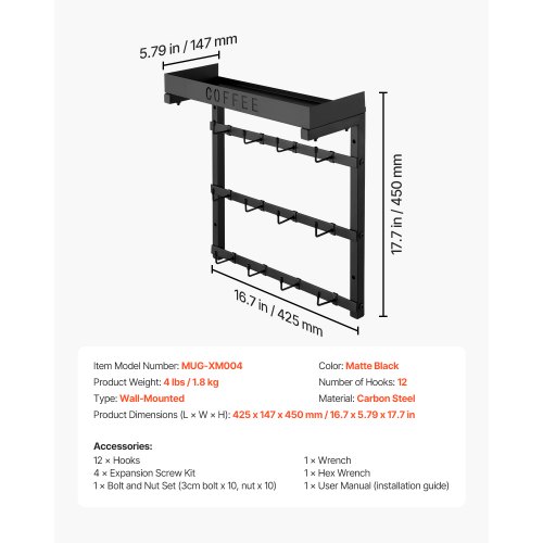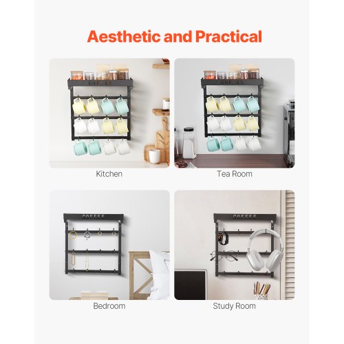 VEVOR Coffee Mug Holder Wall Mounted, 12 Movable Hooks Coffee Cup Hanger for Wall, Carbon Steel Mug Rack with Top Shelf, Coffee Bar Accessories & Organizer, Mug Display for Home Kitchen (Matte Black)