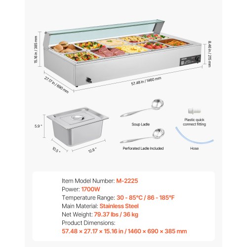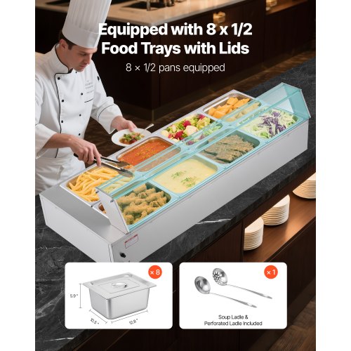 VEVOR Commercial Food Warmer, 1700W Electric Stainless Steel Steam Food Warmer with Glass Cover, 8-Pan Countertop Buffet Bain Marie with Soup & Perforated Ladles, for Catering, Restaurant & Party